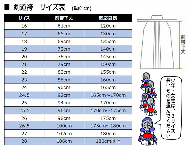 身長(cm):サイズ: 前紐下から裾までの長さ 120cm :16号 :62cm 125cm :17号 :64cm 130cm :18号 :68cm 135cm :19号 :71cm 140cm :20号 :74cm 145cm :21号 :79cm 150cm :22号 :82cm 155cm :23号 :87cm 160cm :24号 :89cm 165cm :25号 :94cm 170cm :26号 :98cm 175cm :27号 :101cm 180cm :28号 :105cm 特長 洗濯による縮みがなく、シワになりにくくなっております。